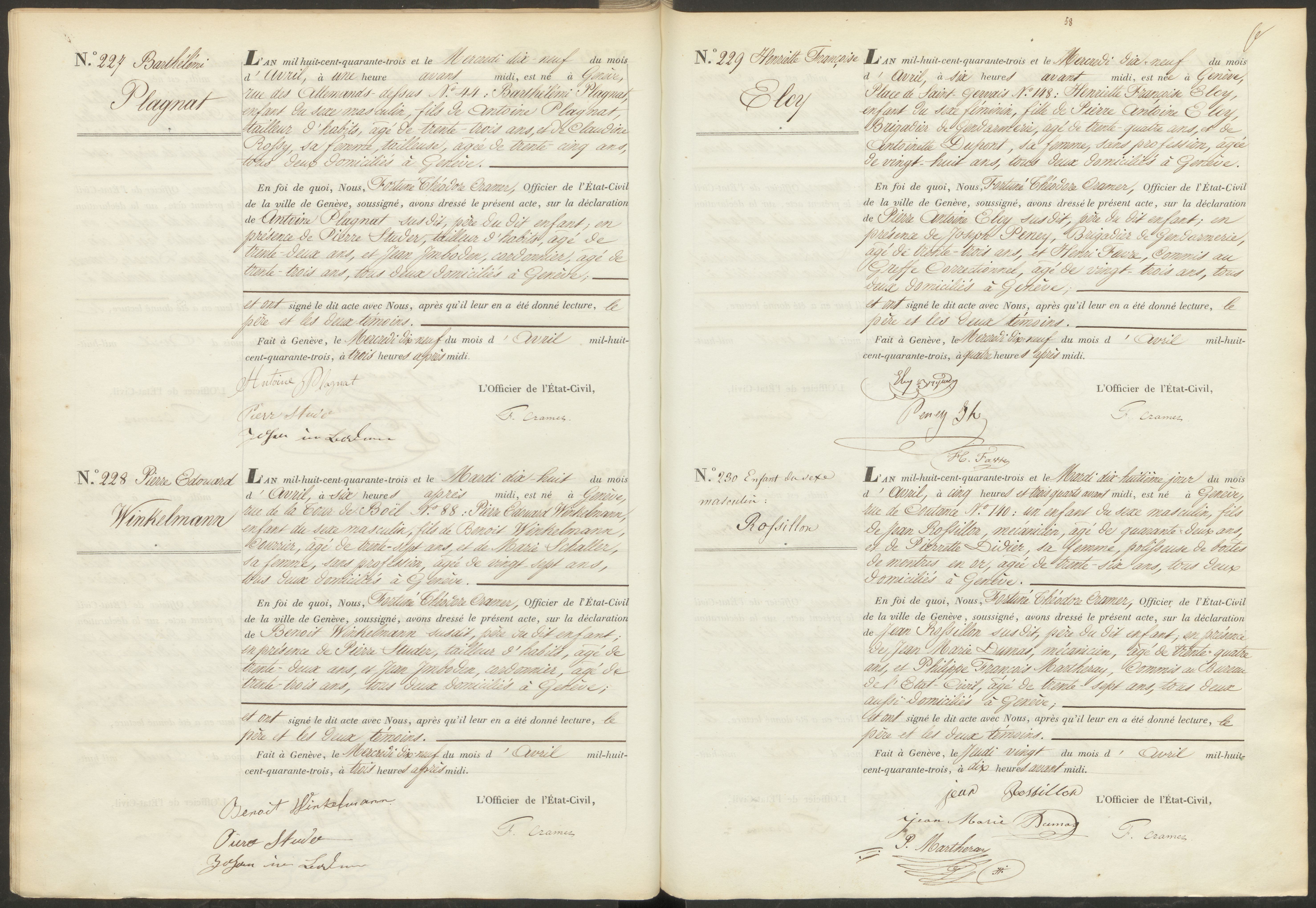 - Seite: Genève, 1843 N, cote E.C. Genève naissances 46, image 076/199, acte 228: naissance Winkelmann, Pierre Edouard